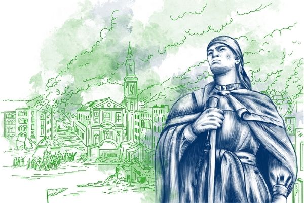 Descripción de la foto para personas con discapacidad visual: ilustración de Atanasio Tzul con un fondo de Totonicapán. (Crédito de foto: COSAMI)